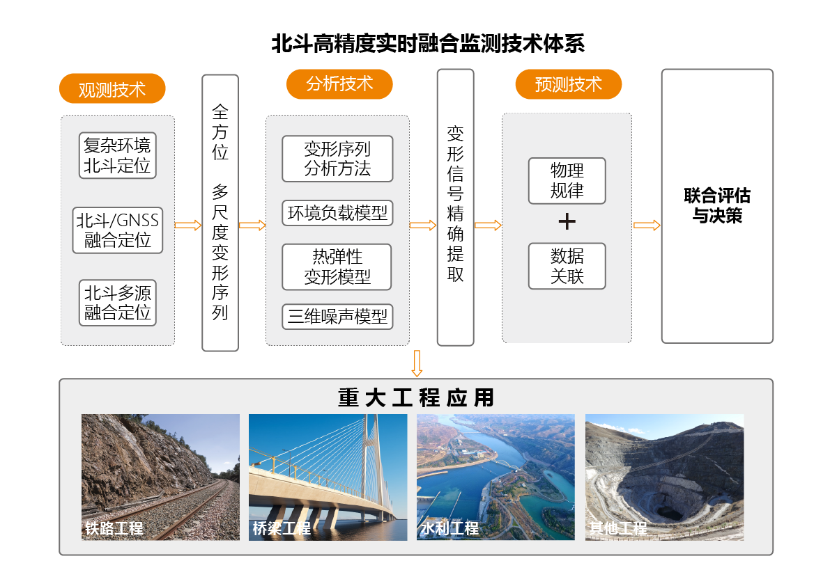 本項(xiàng)目面向基礎(chǔ)設(shè)施安全服役與智能運(yùn)維建設(shè)的國家重大需求,在變形觀測(cè)、分析、評(píng)估和監(jiān)測(cè)平臺(tái)等多方面取得了突破性成果,形成自主創(chuàng)新的北斗高精度實(shí)時(shí)融合技術(shù)體系與監(jiān)測(cè)裝備,實(shí)現(xiàn)了集1毫米級(jí)、實(shí)時(shí)、自動(dòng)、三維一體化變形監(jiān)測(cè)于一體的基礎(chǔ)設(shè)施安全監(jiān)測(cè)新模式。目前,項(xiàng)目成果已廣泛用于鐵路、橋梁、大壩等重大工程的安全監(jiān)測(cè),顯著提升了我國大型基礎(chǔ)設(shè)施安全監(jiān)測(cè)和智能運(yùn)維能力,推進(jìn)了北斗智能融合技術(shù)的應(yīng)用和發(fā)展。