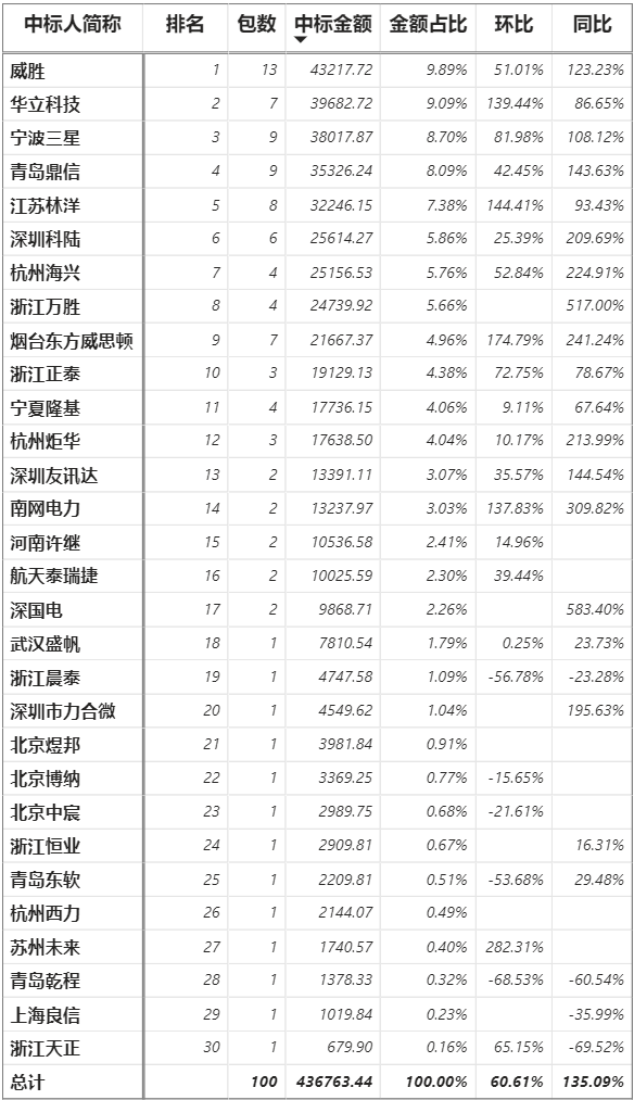 總金額43.68億元,30家企業實現中標(威勝集團+威勝信息計為1家,正泰電器+正泰儀表計為1家),威勝以4.32億元位列各企業第一名,華立中標3.97億元第二,三星3.80億元第三,鼎信3.53億元第四。