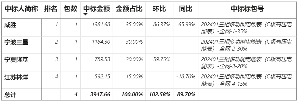 總金額3947.66萬元,4家企業實現中標,威勝中標最大包1381.68萬元;