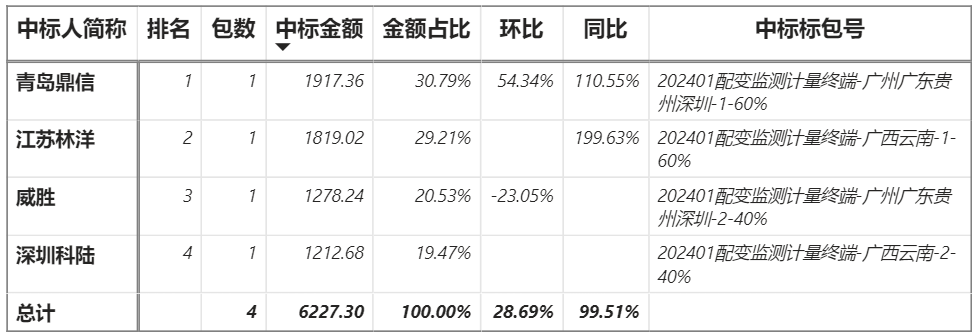 總金額6227.30萬元,4家企業實現中標,鼎信中標最大包1917.36萬元;