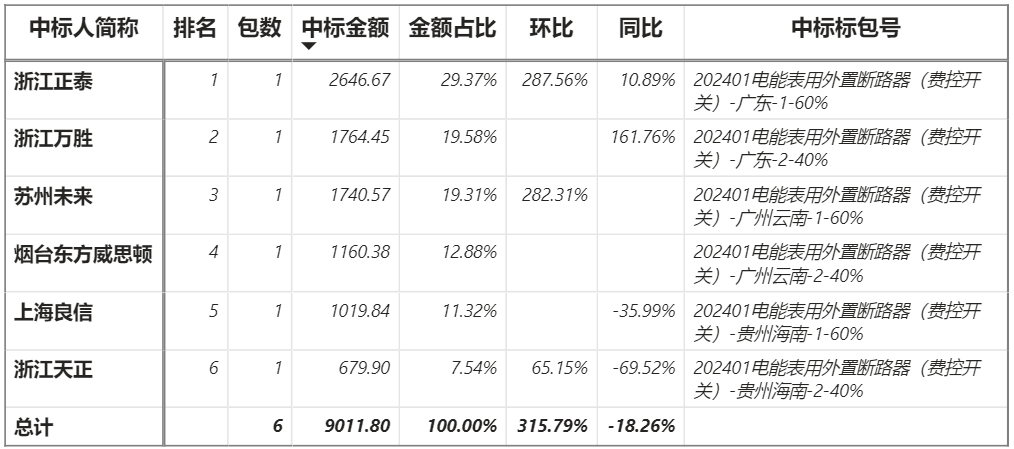 總金額9011.80萬元,6家企業實現中標,正泰中標最大標包2646.67萬元;