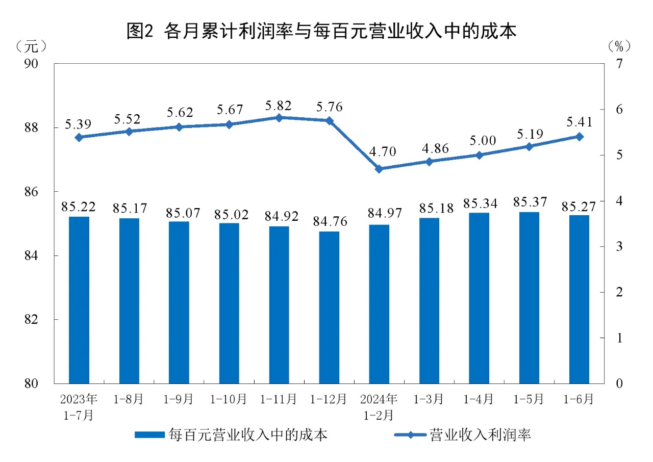 1—6月份,規模以上工業企業實現營業收入64.86萬億元,同比增長2.9%;發生營業成本55.31萬億元,增長2.9%;營業收入利潤率為5.41%,同比提高0.03個百分點。