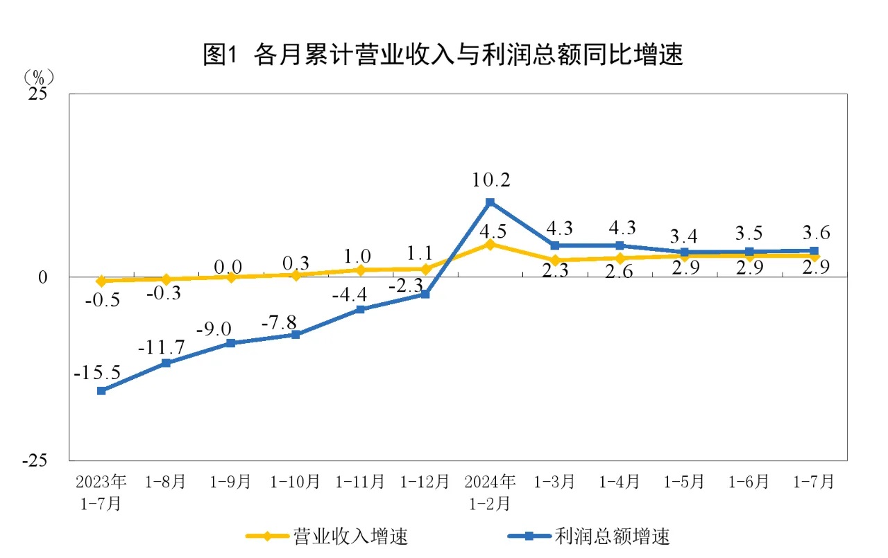 1—7月份,全國規模以上工業企業實現利潤總額40991.7億元,同比增長3.6%(按可比口徑計算,詳見附注二)。