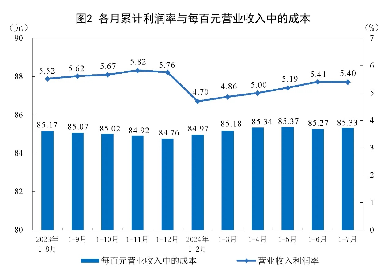 1—7月份,規模以上工業企業實現營業收入75.93萬億元,同比增長2.9%;發生營業成本64.79萬億元,增長3.0%;營業收入利潤率為5.40%,同比提高0.04個百分點。