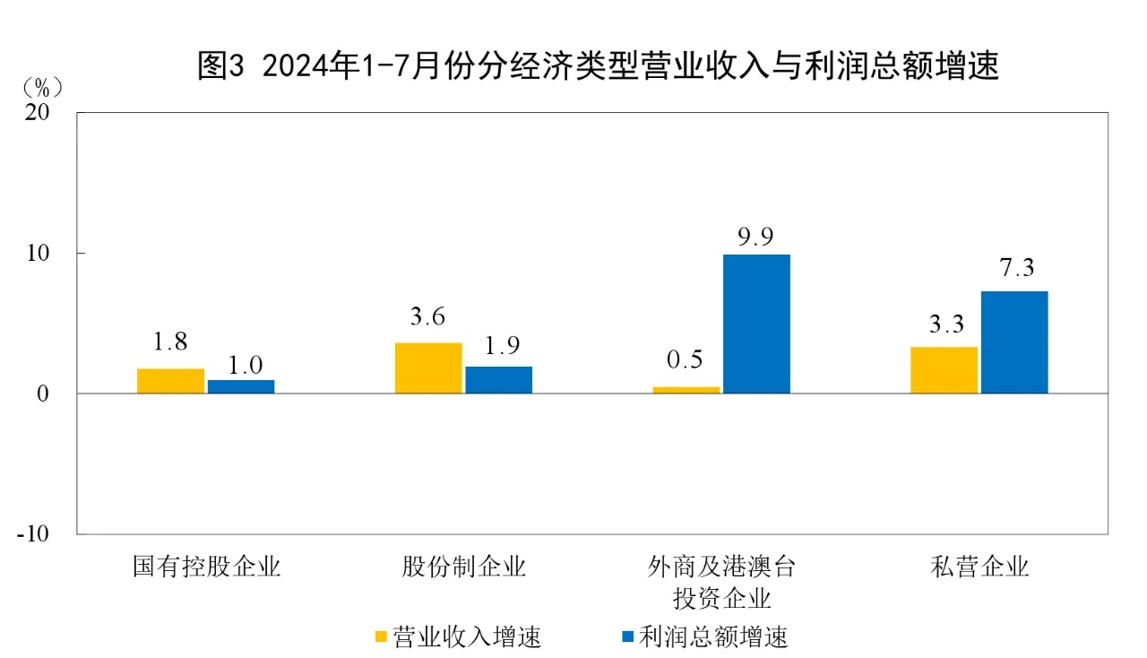 1—7月份,規模以上工業企業中,國有控股企業實現利潤總額13917.3億元,同比增長1.0%;股份制企業實現利潤總額30514.6億元,增長1.9%;外商及港澳臺投資企業實現利潤總額10184.9億元,增長9.9%;私營企業實現利潤總額11031.0億元,增長7.3%