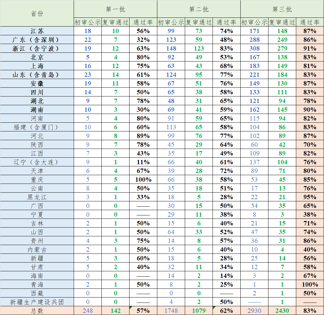 圖3.各省市前三批“小巨人”復審通過率一覽