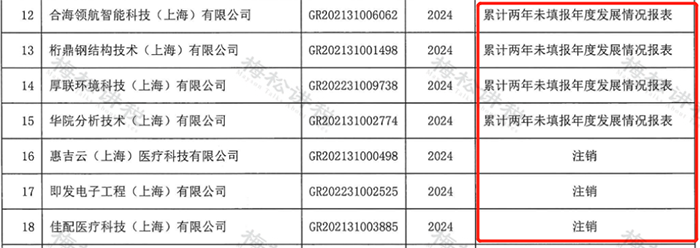 取消原因包括:注銷;研發(fā)費用占比不達標;科技人員占比不達標;未正常開展經(jīng)營活動;累計2年未填報年度發(fā)展報告等。