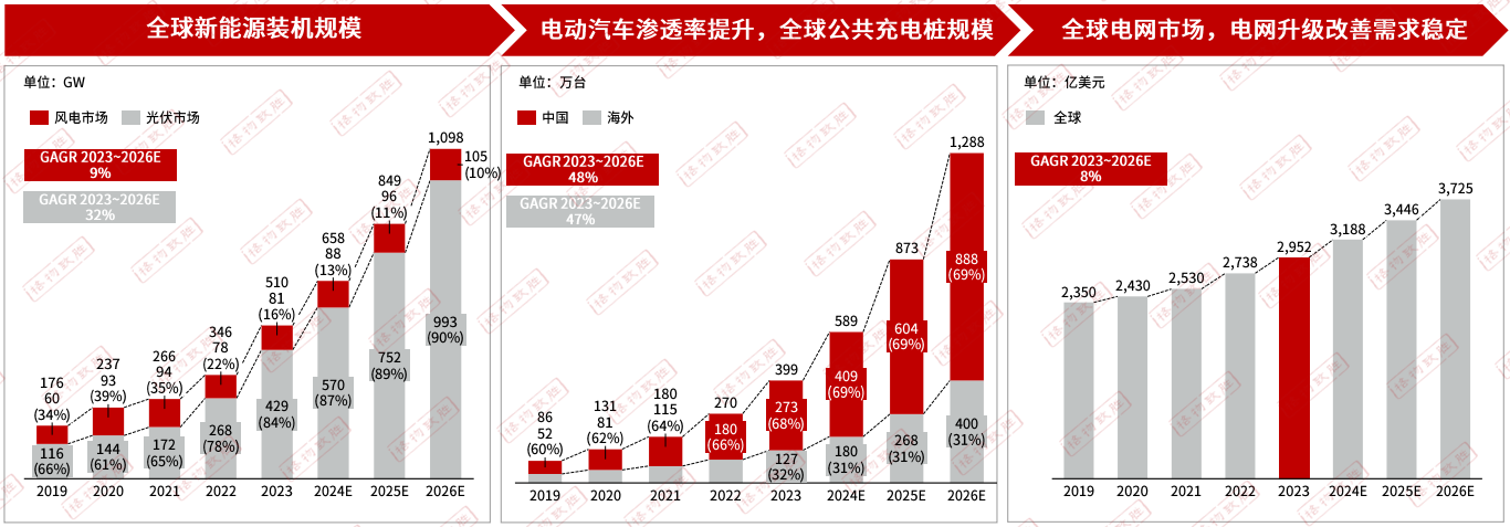 隨著光伏技術(shù)進(jìn)步和產(chǎn)業(yè)規(guī)模化推動(dòng),光伏成本持續(xù)降低,世界光伏新增裝機(jī)量復(fù)合增長(zhǎng)率達(dá)到32%。隨著新能源汽車行業(yè)的發(fā)展,汽車行業(yè)迎來(lái)了較高的增長(zhǎng)期,與之對(duì)應(yīng)的充電樁規(guī)模也隨之高速增長(zhǎng),全球公共充電樁市場(chǎng)規(guī)模以48%的復(fù)合增長(zhǎng)率快速增長(zhǎng)。全球電網(wǎng)投資穩(wěn)定增長(zhǎng),預(yù)計(jì)將以8%的復(fù)合增長(zhǎng)率增長(zhǎng),電網(wǎng)升級(jí)改善需求穩(wěn)定。