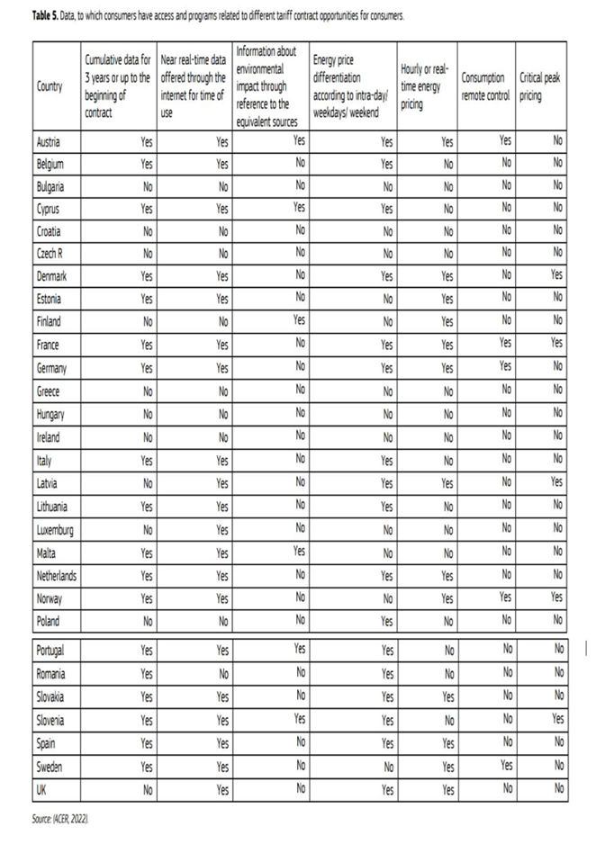 - 根據靈活的電價提供的電力計劃。在這里,我們描述了消費者可以通過智能電表獲得的信息,以及有關通過智能電表提供的資費計劃的信息。表5顯示了消費者可以獲得的歷史消費量,以及有關不同國家/地區通過智能電表提供的靈活關稅產品的信息。這些計劃改善了消費者的賦權,因為它們使客戶能夠調整電力消耗并利用動態電價。為了讓計劃生效,客戶需要對價格信號做出反應。預計從 2023 年起將不再提供固定價格合同,而《電力內部市場指令》規定,成員國必須確保配備智能電表的消費者能夠至少從一家供應商(擁有超過 200,000 名客戶)獲得動態價格合同。應向消費者明確此類合同的特征(ACER,2022 年)。