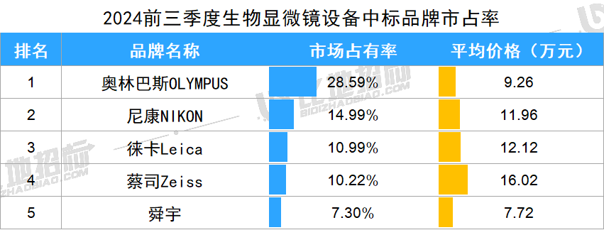 生物顯微鏡:2024年前三季度中標2834臺,前3