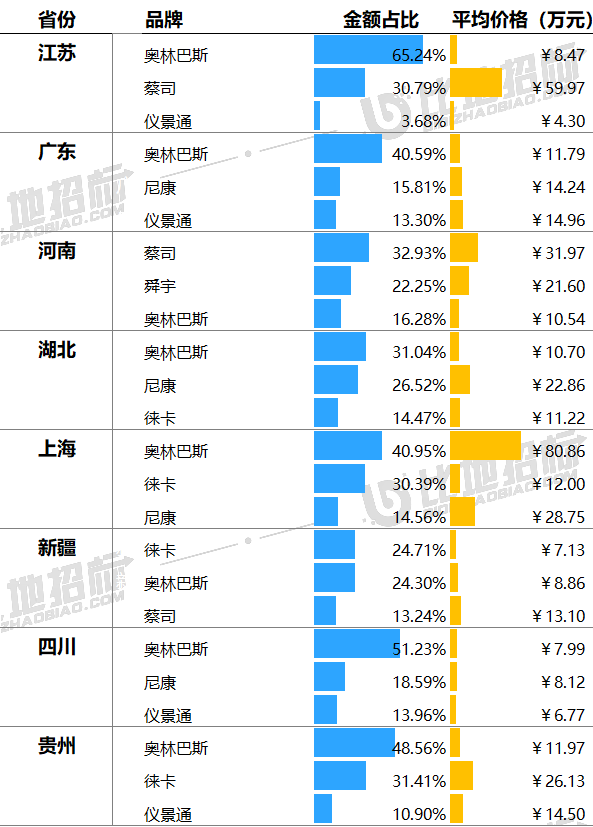 不同地區對品牌的偏好有所不同,江蘇偏好奧林巴斯、蔡司、儀景通;廣東偏好奧林巴斯、尼康、儀景通;河南偏好蔡司、舜宇、奧林巴斯等。