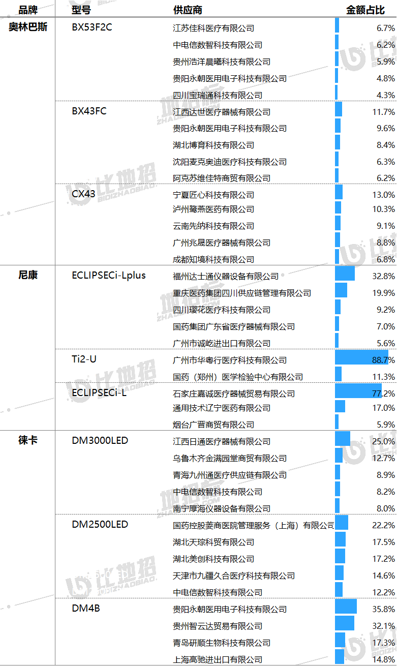 主要供應商及對應中標品牌包括:江西日通醫療器械有限公司(徠卡),江蘇佳科醫療有限公司(奧林巴斯),福州達士通儀器設備有限公司(尼康)等。
