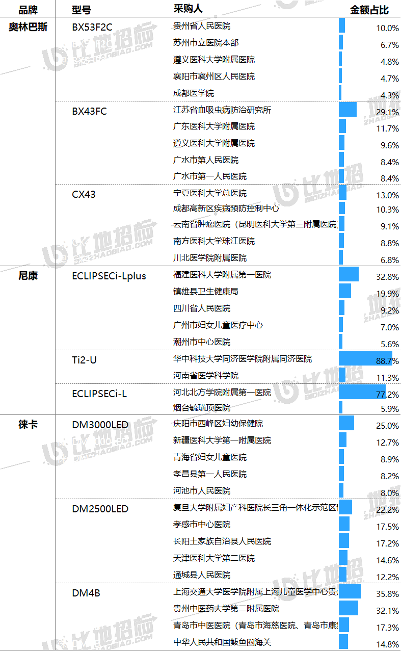 主要采購單位及對應中標品牌包括:貴州省人民醫院(奧林巴斯),慶陽市西峰區婦幼保健院(徠卡),福建醫科大學附屬第一醫院(尼康)等。