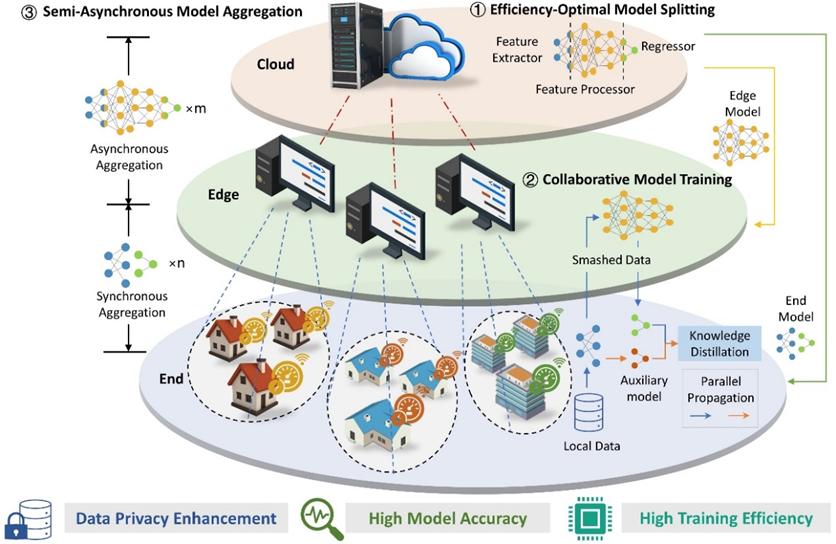 通過實施最優模型分割、并行模型訓練和分層模型聚合策略,設計的聯邦分割學習算法可以在內存占用、通信開銷和訓練時間等方面顯著提高智能電表邊緣智能的可行性(圖3)。該方法的核心在于,以隱私保護的方式協同利用分布式數據訓練部署在多層級設備上的模型,實現了電網不同層級設備之間的算力-數據協同,極大地提高了能源管理效率和數據安全性。