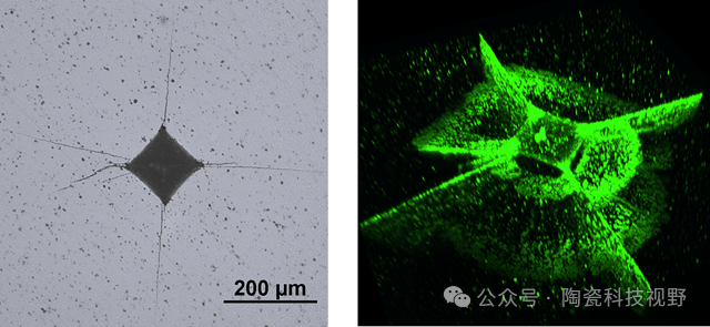 將方形金字塔形金剛石壓頭(維氏壓頭)壓入陶瓷表面,人為地引入壓痕和裂紋。使用普通金相顯微鏡觀察反射圖像時,只能在暴露于表面的區(qū)域觀察到裂紋,如下圖左所示,為此,研究團隊開發(fā)了一種在室溫和大氣壓下使用激光熒光顯微鏡從表面沿深度方向觀察熒光圖像的技術。