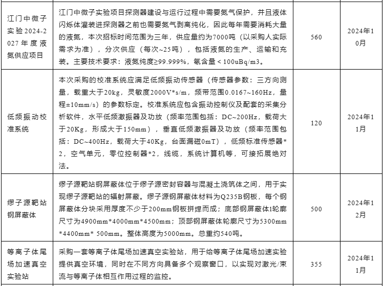 近日,中國科學院高能物理研究所發布25項儀器設備采購意向,預算總額達0.98億元,涉及CSNS-II逆幾何分子振動譜儀分析晶體、高速細線楔形鍵合機、背散射譜儀束線前端鋼屏蔽體、X射線大視場平板成像探測器等,預計采購時間為2024年10月~2025年1月。