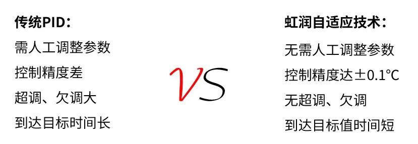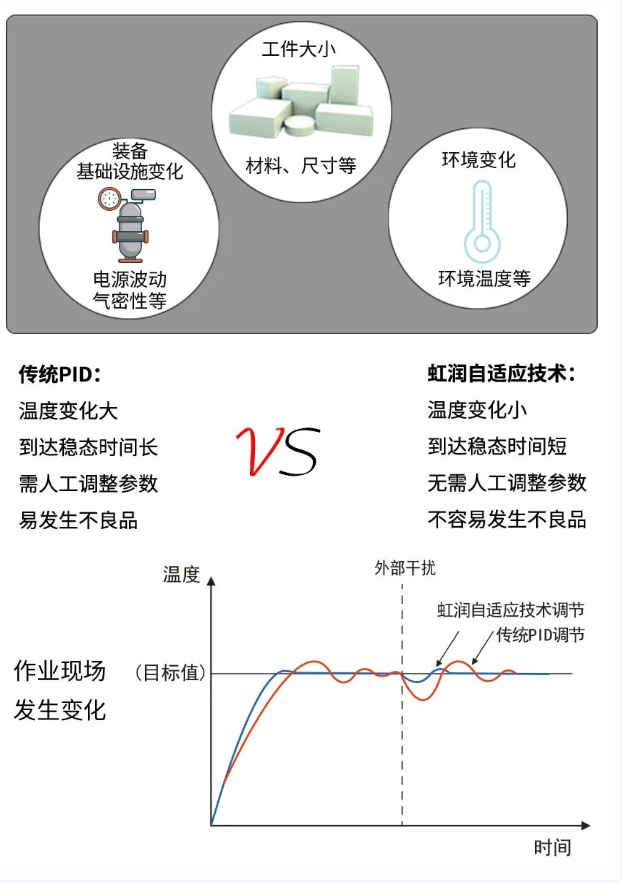 虹潤(rùn)自適應(yīng)控制技術(shù)可自動(dòng)整定出較佳PID值。監(jiān)視裝備的溫度控制狀態(tài),自動(dòng)調(diào)節(jié)PID值,對(duì)工件變化及裝備變化、環(huán)境變化等進(jìn)行較佳溫度控制。