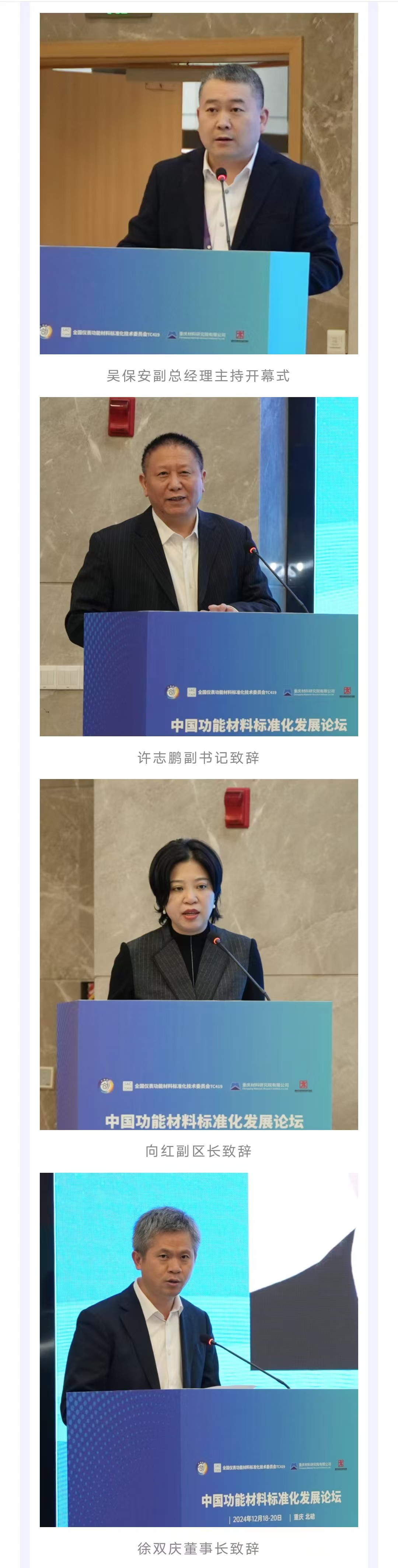 開幕式由重材院黨委委員、副總經(jīng)理(主持經(jīng)理層工作)吳保安主持。許志鵬副書記、向紅副區(qū)長、徐雙慶董事長分別致辭并指出功能材料是支撐國民經(jīng)濟發(fā)展的基礎(chǔ)性產(chǎn)業(yè),是產(chǎn)業(yè)基礎(chǔ)再造的主力軍和工業(yè)綠色發(fā)展的主戰(zhàn)場。標(biāo)準(zhǔn)在功能材料工業(yè)發(fā)展中發(fā)揮著基礎(chǔ)性、引領(lǐng)性作用。希望與會專家學(xué)者凝心聚力,積極建言獻策,不斷開創(chuàng)功能材料標(biāo)準(zhǔn)化工作新局面,為發(fā)展新質(zhì)生產(chǎn)力,實現(xiàn)功能材料行業(yè)高質(zhì)量發(fā)展貢獻力量。