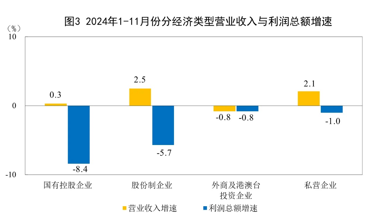1—11月份,規模以上工業企業中,國有控股企業實現利潤總額20387.7億元,同比下降8.4%;股份制企業實現利潤總額50143.0億元,下降5.7%;外商及港澳臺投資企業實現利潤總額16062.9億元,下降0.8%;私營企業實現利潤總額19649.1億元,下降1.0%