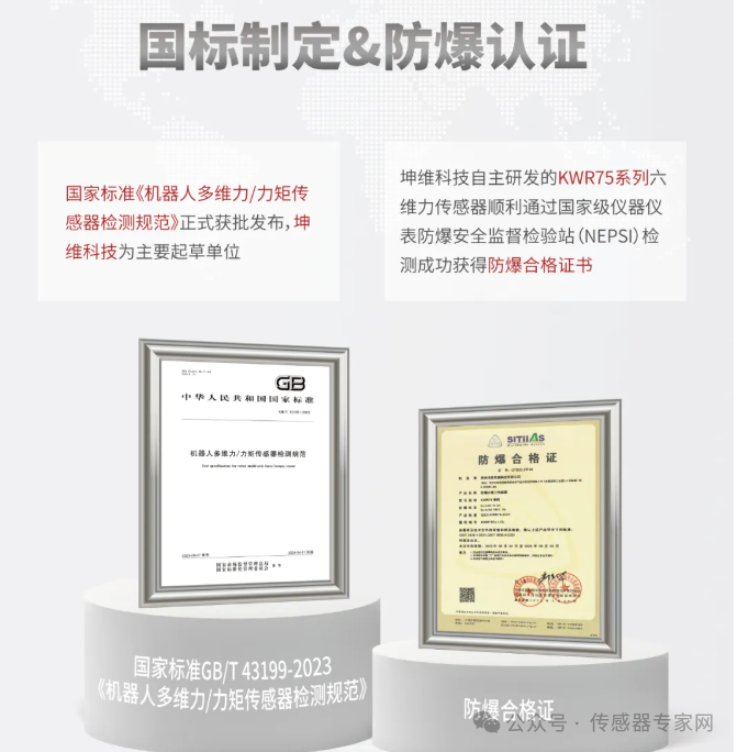 為擴張未來機器人在更多場景的應用,坤維科技率先研發出獲得防爆認證標準(等同于國際IEC60079標準體系)的KWR75系列六維力傳感器,可在煤礦、金屬加工、造紙等工業粉塵較多的場景中使用——這些惡劣環境往往對人形機器人有更強烈的需求。