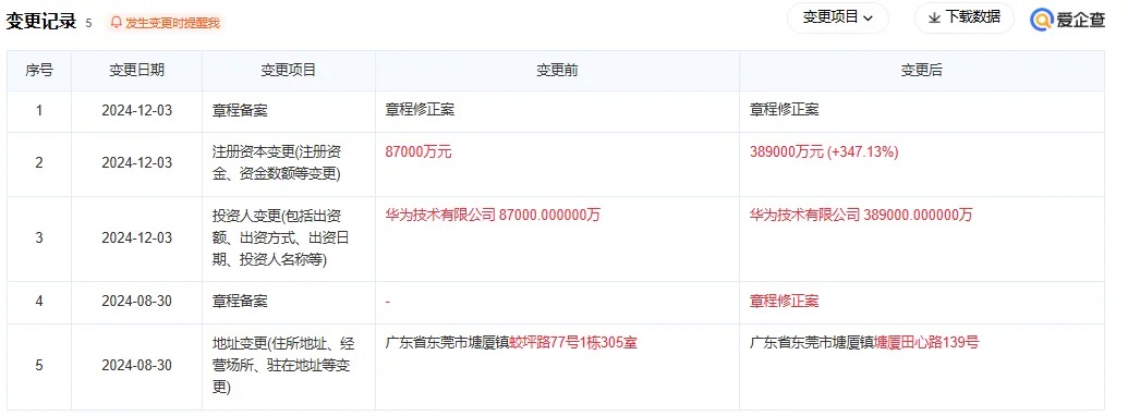 123日,華為對其全資持股的機器人企業——東莞極目機器有限公司,增資30余億元,注冊資本從8.7億人民幣增至38.9億人民幣,增幅約347%