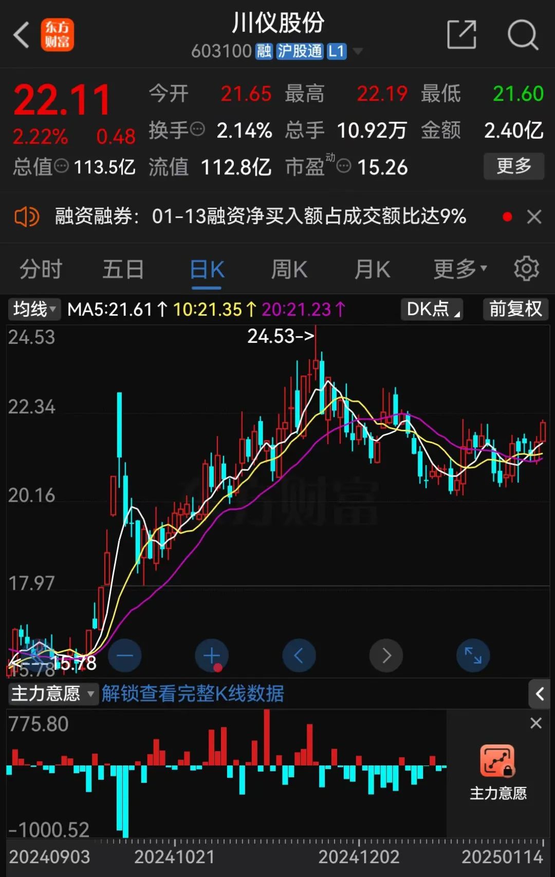114日收盤,川儀股份股價報22.11/股,漲幅為2.22%,總市值為113.5億元。
