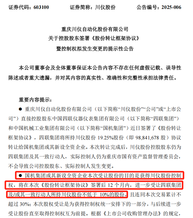 公告顯示,113日,四聯集團與國機集團簽署《股份轉讓框架協議》,約定由國機集團或其新設全資企業,協議受讓四聯集團所持川儀股份9884.17萬股股份,占川儀股份總股本的比例為19.25%