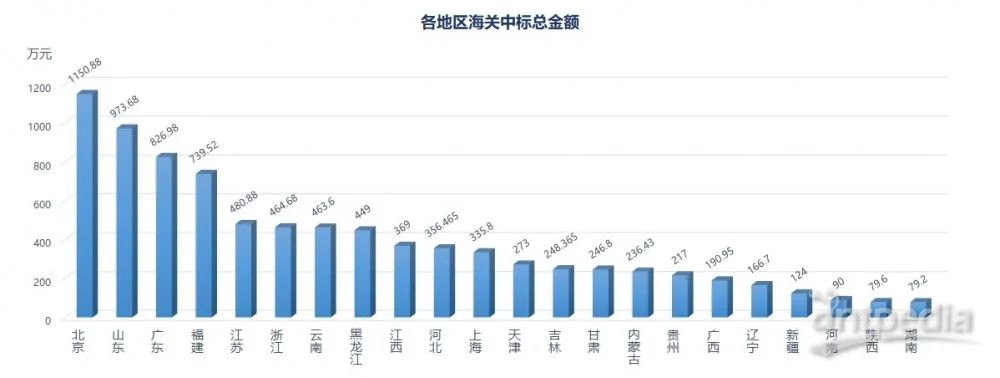 在采購(gòu)金額方面,北京、山東和廣東依舊名列前茅,中標(biāo)金額分別達(dá)到1150.88萬(wàn)元、973.68萬(wàn)元和826.98萬(wàn)元,福建和江蘇也表現(xiàn)突出,中標(biāo)金額為739.52萬(wàn)元和 480.88萬(wàn)元。排名前五的地區(qū),其中標(biāo)金額之和占據(jù)了總中標(biāo)金額的近50%。同時(shí)也可以看出,中標(biāo)金額與中標(biāo)數(shù)量密切相關(guān)。