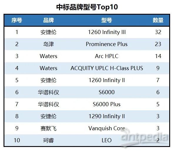 根據(jù)此次中標(biāo)結(jié)果,分析測(cè)試百科網(wǎng)梳理出品牌熱門(mén)型號(hào) Top10。從中標(biāo)型號(hào)分布來(lái)看,安捷倫憑借1260系列(含Infinity III、Infinity II)全面領(lǐng)跑市場(chǎng),其中1260 Infinity III以32臺(tái)(套)的絕對(duì)優(yōu)勢(shì)獨(dú)占鰲頭,憑借高精度、高穩(wěn)定性和廣泛的應(yīng)用場(chǎng)景,贏得了海關(guān)單位的青睞。島津Prominence Plus系列和Waters的Arc HPLC與ACQUITY UPLC H-Class PLUS分別位列二、三、四位。國(guó)內(nèi)品牌中,華譜科儀的S6000和S6000 Plus與珂睿的LEO成為唯二上榜的國(guó)產(chǎn)代表型號(hào)。整體而言,國(guó)際品牌的多種型號(hào)依舊主導(dǎo)市場(chǎng),國(guó)產(chǎn)設(shè)備在技術(shù)適配性和應(yīng)用場(chǎng)景拓展方面,仍有較大的提升空間。