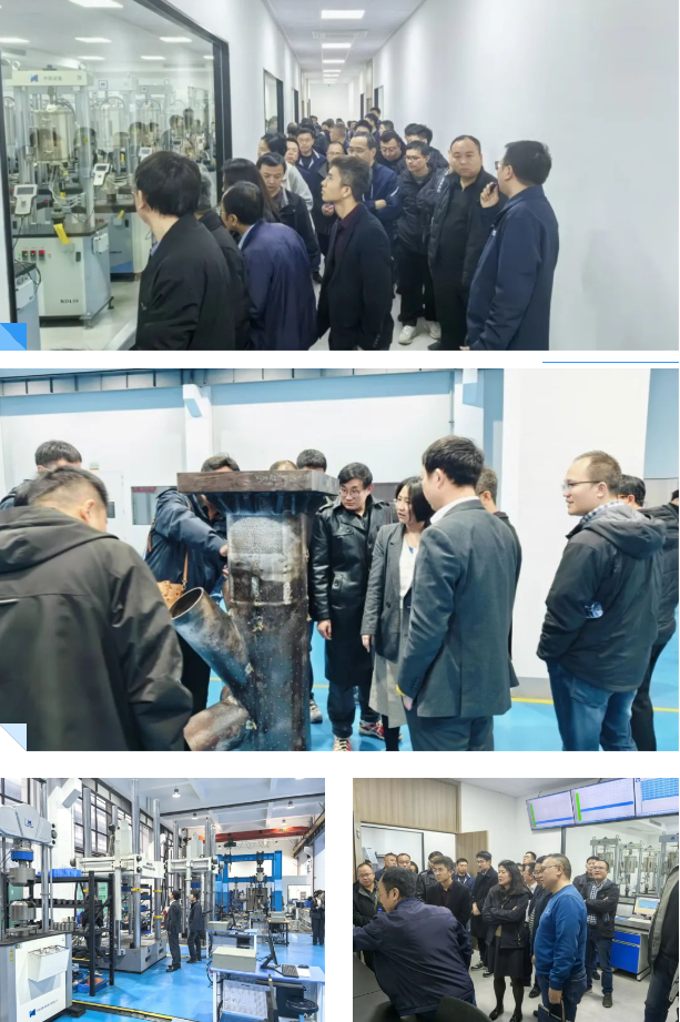 隨后參觀考察了公司的高溫蠕變試驗系統、極端環境力學測試系統、電子萬能試驗系統、液壓萬能試驗系統等一系列旗艦產品并對中機檢測的業務實力有了更深層次的了解。中機試驗通過“設備+數據+服務”一體化解決方案,向專家們詳細介紹了各系統的技術特點、應用領域以及典型案例。專家們就系統性能、測試方法、數據分析等方面提出了寶貴的意見和建議。雙方還就鋼鐵行業測試試驗技術發展趨勢、行業標準制定等話題進行了深入交流。