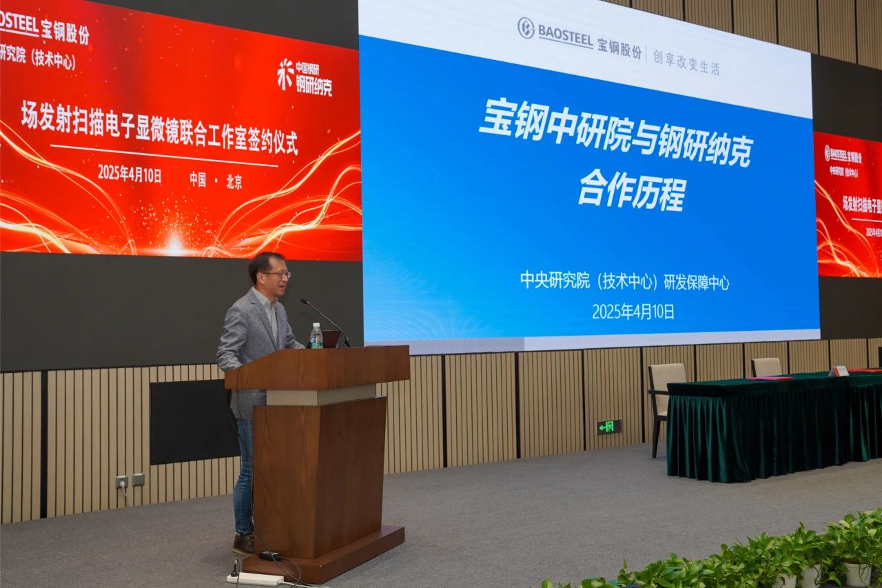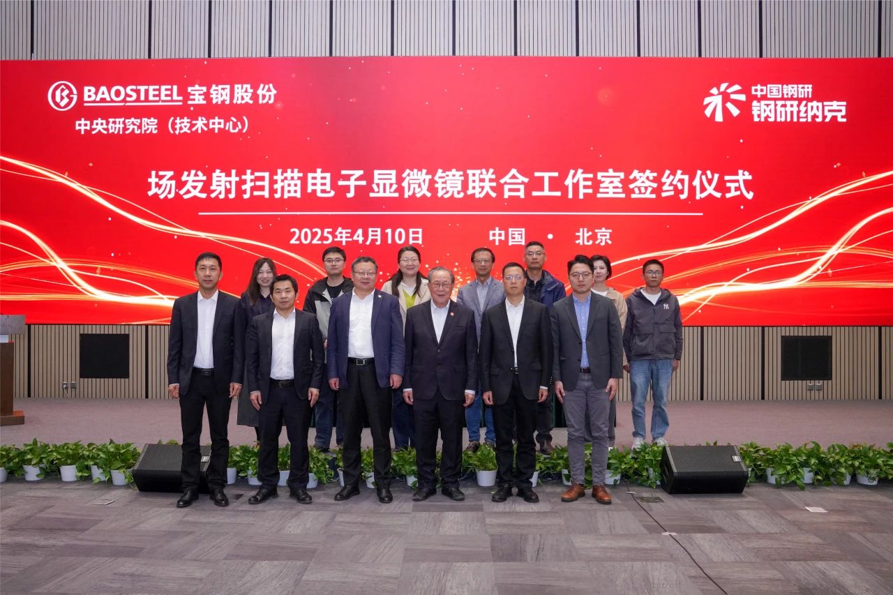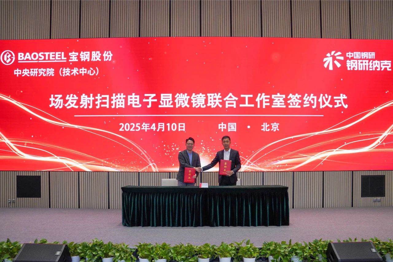410日,納克微束(北京)有限公司(以下簡稱納克微束)與寶鋼股份中央研究院(技術中心)(以下簡稱寶鋼中研院)簽署掃描電鏡合作協議并舉行聯合工作室揭牌儀式,中國工程院王海舟院士,鋼研納克黨委書記、董事長楊植崗,副總經理袁良經,總工程師沈學靜,寶鋼中研院副院長田正宏、研發保障中心主任徐棟愷,納克微束總經理于兆斌等出席本次儀式。