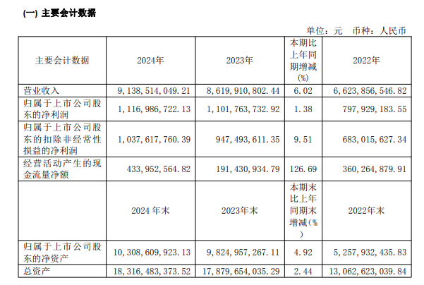 該公司營業收入達91.39億元,同比增長6.02%;歸母凈利潤為11.17億元,同比增長1.38%;扣非歸母凈利潤10.38億元,同比增長9.51%