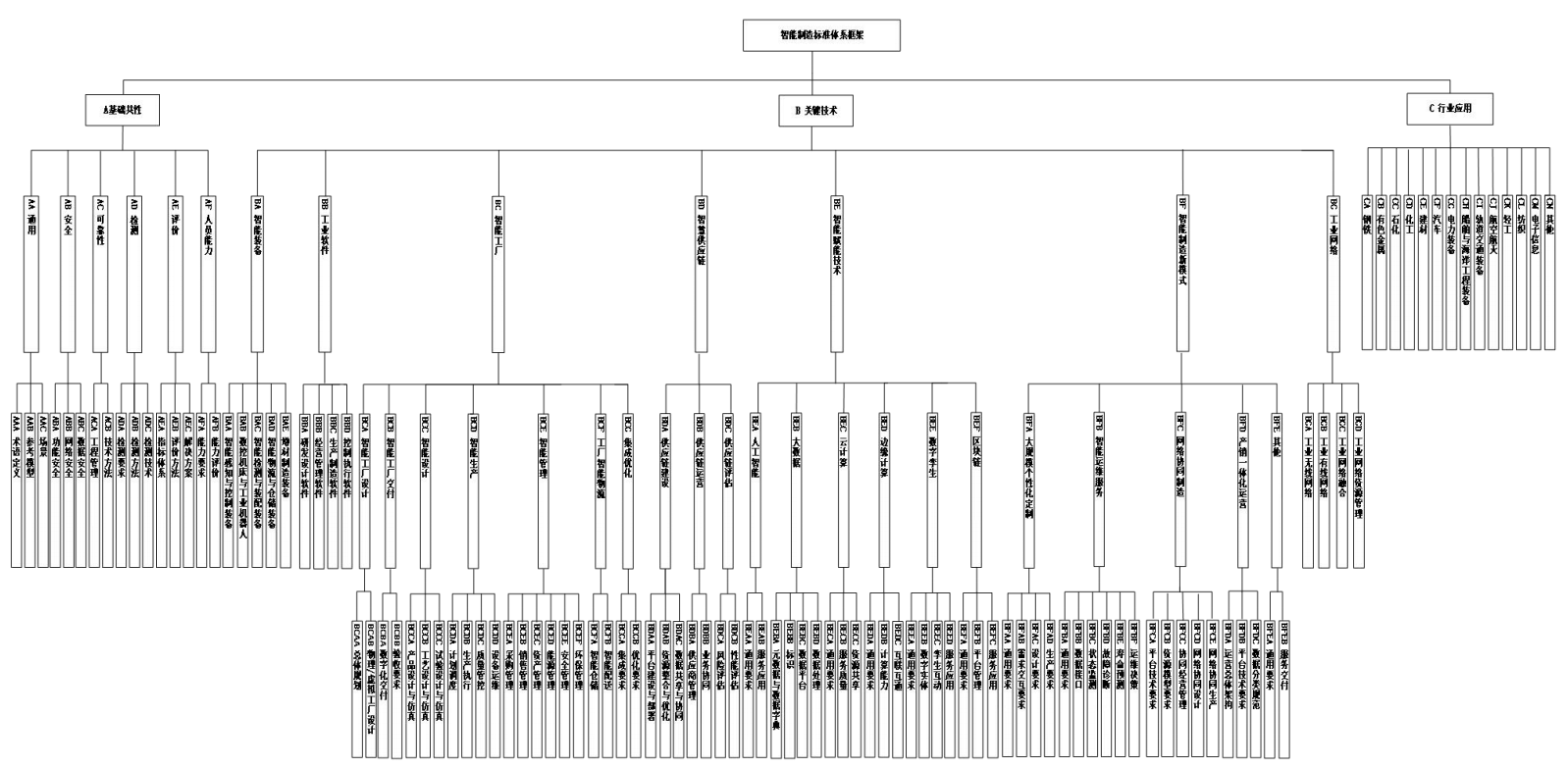 智能制造標(biāo)準(zhǔn)體系框架圖包含了智能制造標(biāo)準(zhǔn)體系的基本組成單元,具體包括A基礎(chǔ)共性、B關(guān)鍵技術(shù)、C行業(yè)應(yīng)用等3個部分,如圖3所示。