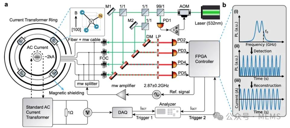 孫方穩(wěn)團隊長期開展金剛石量子傳感器件的加工制備研究,攻克了系列關鍵技術。為了解決電流測量難題,此次研究中團隊采用光纖-金剛石傳感器進行高壓電流測量,四個集成化金剛石量子傳感器均勻分布在磁屏蔽環(huán)中,其[100]晶向與交流磁場平行以提高信噪比。研究提出了在零偏置磁場下對熒光信號進行倍頻轉換和加權平均的處理方法,該方法能夠重構50赫茲交流電的波形;同時,為了拓寬電流測量動態(tài)范圍,采用共振頻率跟蹤方法,保持金剛石傳感器對不同大小電流導致磁場變化的敏感性;針對實際應用中系統(tǒng)溫度變化影響測量精度的問題,通過雙頻量子控制方法可抑制溫度漂移;最后在0至1000安培范圍內(nèi)進行電流測量,將測量結果與標準電流互感器進行對比,實現(xiàn)了0.05%的測量精度。