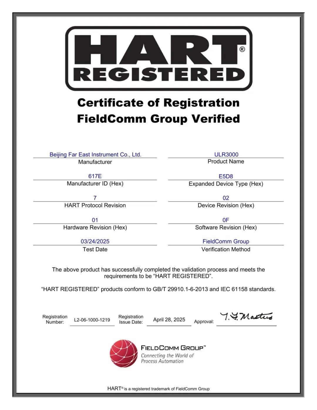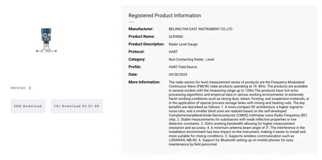 近日,遠(yuǎn)東儀表公司自主研發(fā)的ULR3000連續(xù)調(diào)頻雷達(dá)物位計(jì)正式通過國際權(quán)威機(jī)構(gòu) Field Comm Group的HART® 7通信協(xié)議認(rèn)證(注冊號:L2-06-1000-1219),并嚴(yán)格符合 GB/T 29910.1-6-2013和IEC 61158國際標(biāo)準(zhǔn),標(biāo)志著該產(chǎn)品在技術(shù)性能、通信兼容性及標(biāo)準(zhǔn)化水平上達(dá)到國際領(lǐng)先水準(zhǔn)。