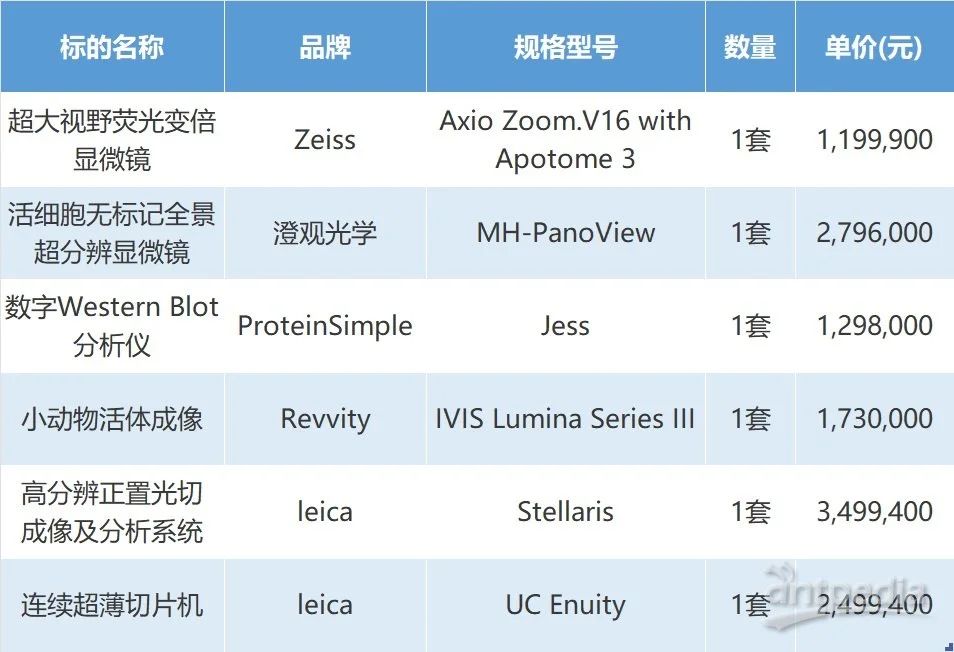 近日,中國科學院基礎醫學與腫瘤研究所(籌)(簡稱“中科院醫學所”)一批尖端科研設備成功中標,總中標金額達1302.27萬元。此次中標設備涵蓋超大視野熒光變倍顯微鏡、活細胞無標記全景超分辨顯微鏡、數字 Western Blot 分析儀、小動物活體成像等,品牌包括蔡司、澄觀光學、ProteinSimple、瑞孚迪和徠卡。這批設備的引入,將為研究所的研究注入強大動力。