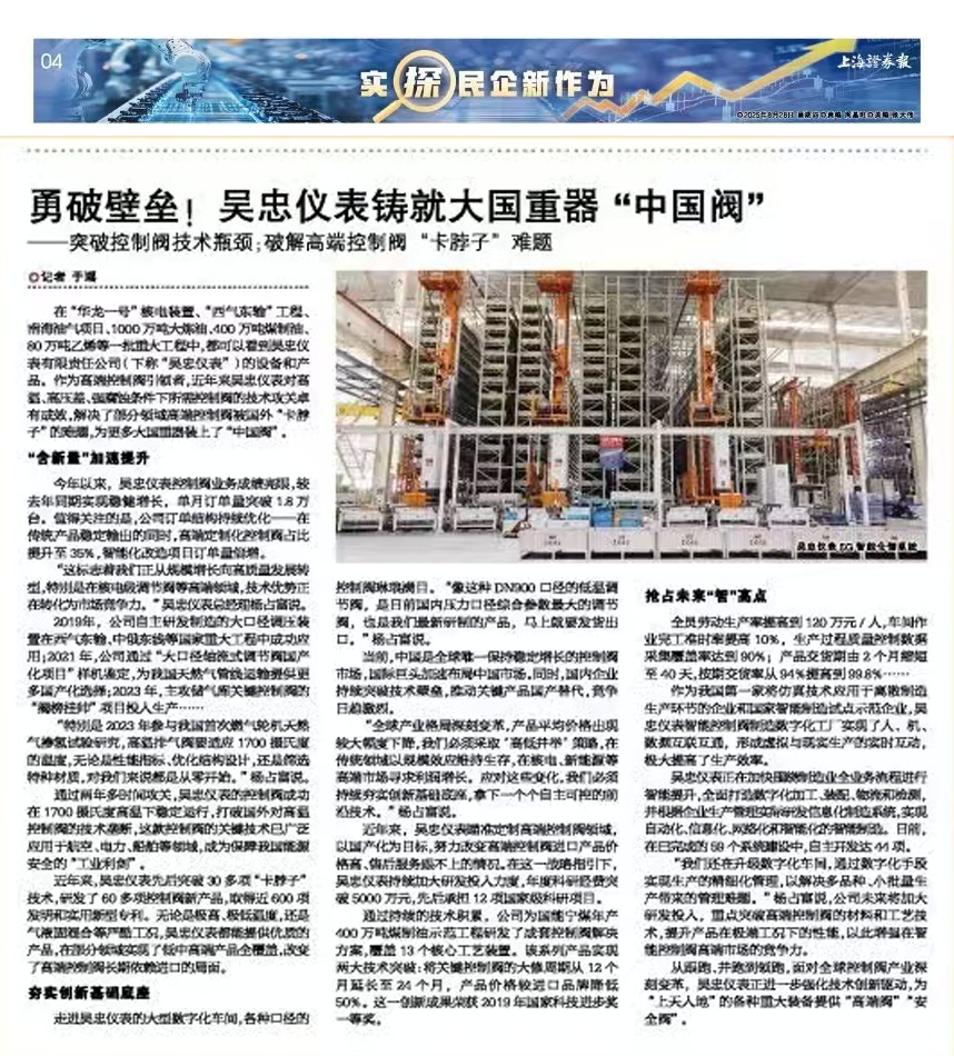 從跟跑、并跑到領(lǐng)跑,面對全球控制閥產(chǎn)業(yè)深刻變革,吳忠儀表正進(jìn)一步強(qiáng)化技術(shù)創(chuàng)新驅(qū)動,為“上天入地”的各種重大裝備提供“高端閥”“安全閥”。