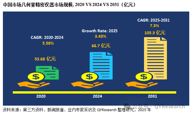 幾何量精密儀器是指用于測量物體長度、角度、形狀、位置、輪廓、形位誤差等幾何參數(shù)的高精度測量設(shè)備,是計量測試領(lǐng)域的基礎(chǔ)儀器之一,在工業(yè)生產(chǎn)、國家計量等領(lǐng)域具有重要作用。根據(jù)研究團(tuán)隊調(diào)研統(tǒng)計,中國市場在過去幾年變化較快,2024年中國幾何量精密儀器市場銷售額達(dá)到了66.7億元,預(yù)計2031年將達(dá)到105.3億元,年復(fù)合增長率(CAGR)為7.3%2025-2031)。