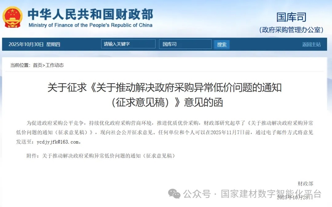 1028日,財政部發布關于征求《關于推動解決政府采購異常低價問題的通知(征求意見稿)》意見的函。