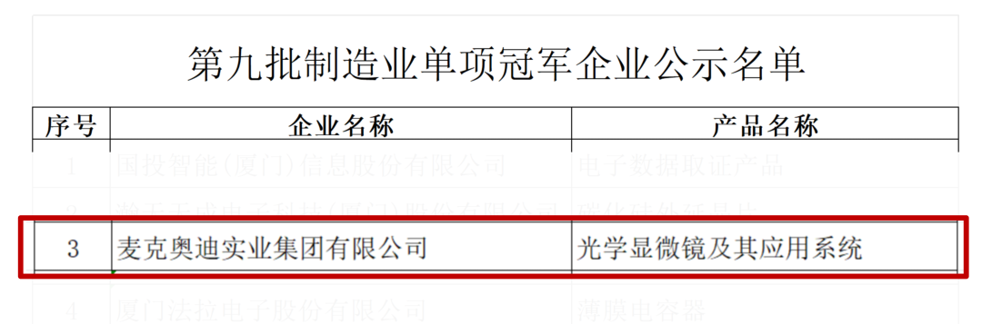 近日,工業和信息化部(簡稱“工信部”)正式公示第九批制造業單項冠軍企業名單,麥克奧迪實業集團有限公司(以下簡稱“麥克奧迪光學”)憑借其光學顯微鏡及應用系統在教育細分領域的卓越表現,成功入選,獲評“國家級制造業單項冠軍企業”。這一榮譽不僅彰顯了麥克奧迪光學在細分領域的持續領跑實力,也標志著中國光學顯微鏡制造業邁向更高水平。