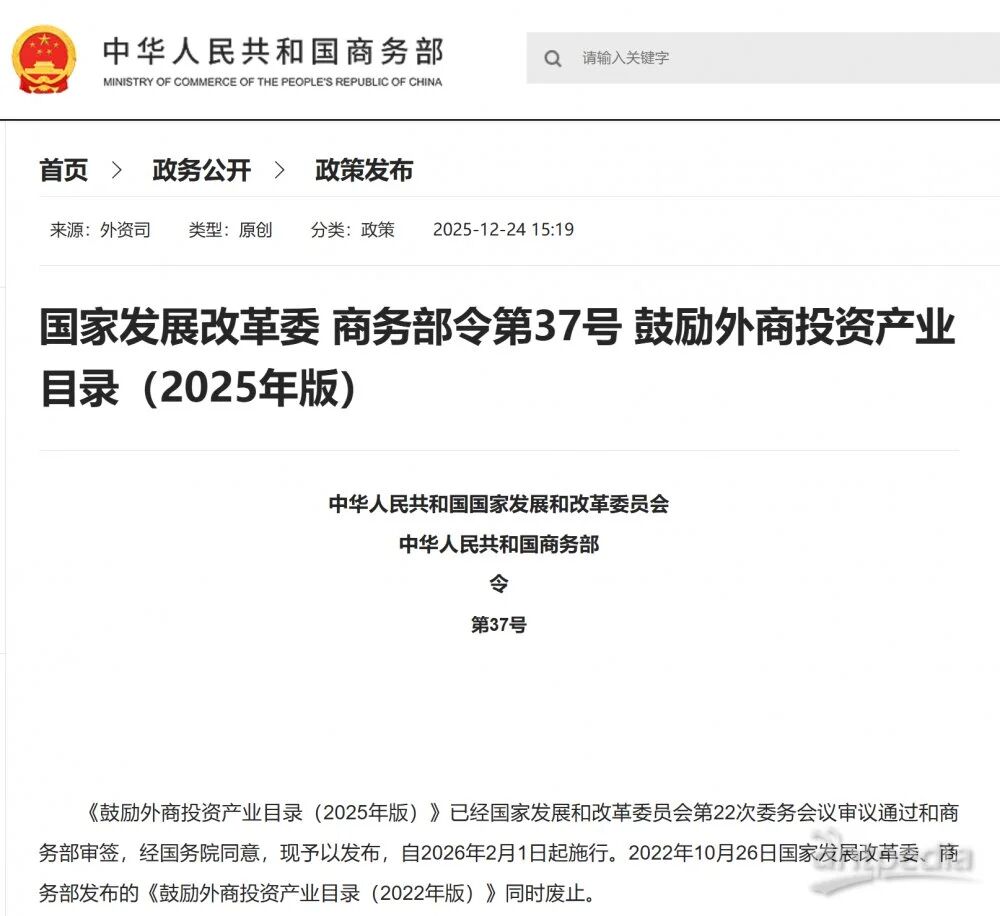近日,經(jīng)國(guó)務(wù)院同意,國(guó)家發(fā)展改革委、商務(wù)部全文發(fā)布《鼓勵(lì)外商投資產(chǎn)業(yè)目錄(2025年版)》(以下簡(jiǎn)稱《鼓勵(lì)目錄》),自2026年2月1日起施行。