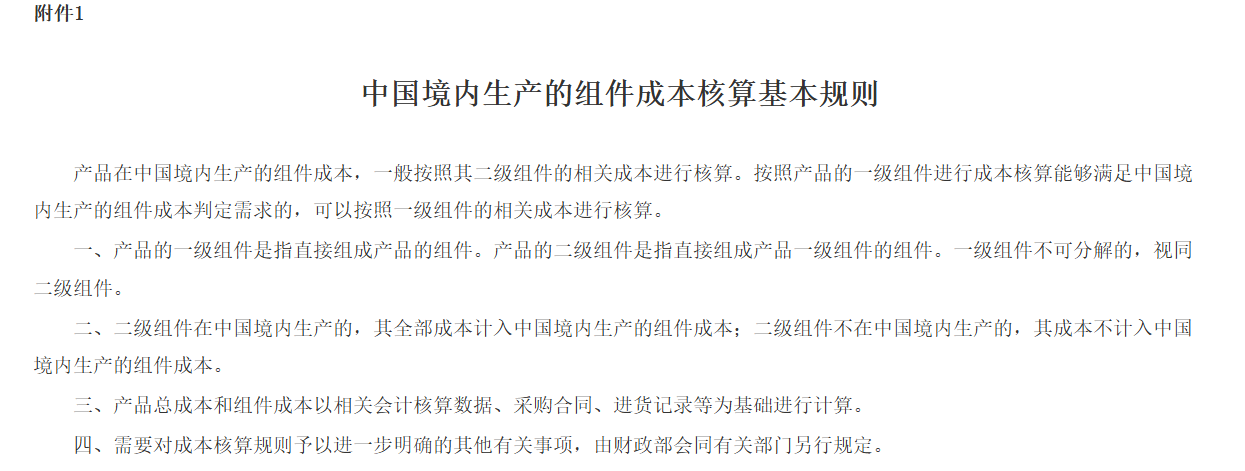 (二)科學制定本國產品具體標準要求。財政部將會同工業和信息化部等有關行業主管部門,分類施策、穩妥推進,根據不同行業特點和我國產業發展實際,在充分征求有關內外資企業、行業商會協會等方面意見的基礎上,依據企業產品成本核算制度等,分產品制定中國境內生產的組件成本占比要求,以及特定產品的關鍵組件、關鍵工序相關要求,明確成本核算規則,并合理設置過渡期,保障標準符合實際、具有可操作性。