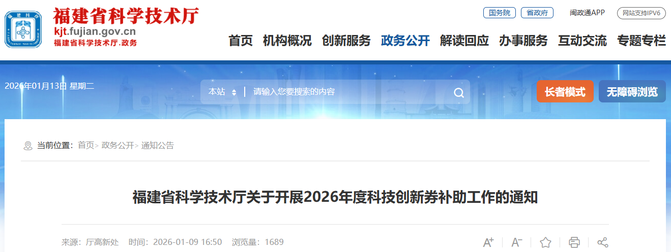 福建省科學(xué)技術(shù)廳關(guān)于開(kāi)展2026年度科技創(chuàng)新券補(bǔ)助工作的通知