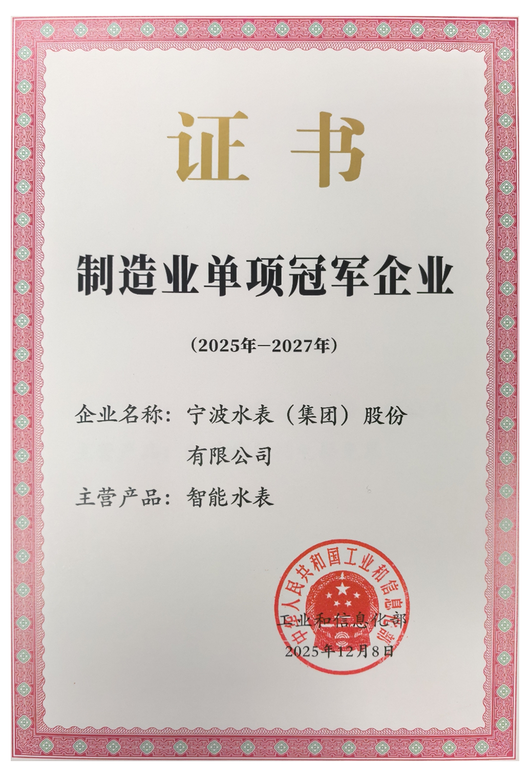 近日,工業和信息化部正式公布制造業單項冠軍企業復核通過名單,寧波水表(集團)股份有限公司(以下簡稱“寧水集團”)再次榮膺國家級制造業單項冠軍企業稱號,成為行業內唯一蟬聯該國家級榮譽的標桿企業。此次復核成功,不僅是對寧水集團在智能水計量領域全球領先地位的權威認證,更是對企業構建并持續深化技術、制造與品牌全方位核心競爭力的國家級認可。