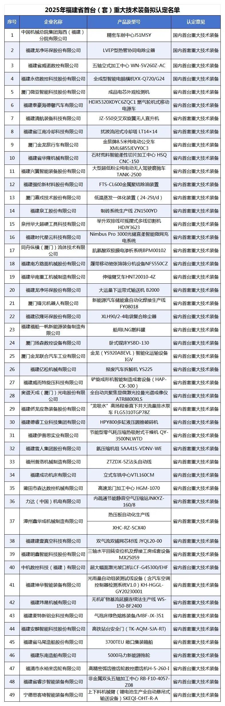 福建省工信廳公示2025年福建省首臺(套)重大技術(shù)裝備認定名單49家企業(yè)上榜一起來看下具體名單。